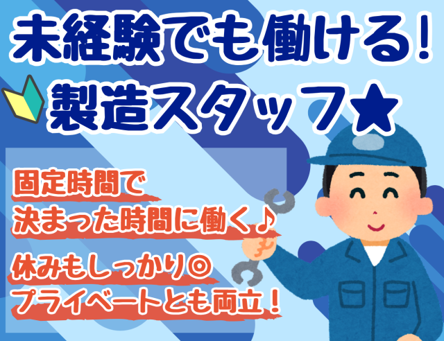 | アピールポイント | 未経験者大歓迎!土日祝日休みで日勤のみのお仕事 |